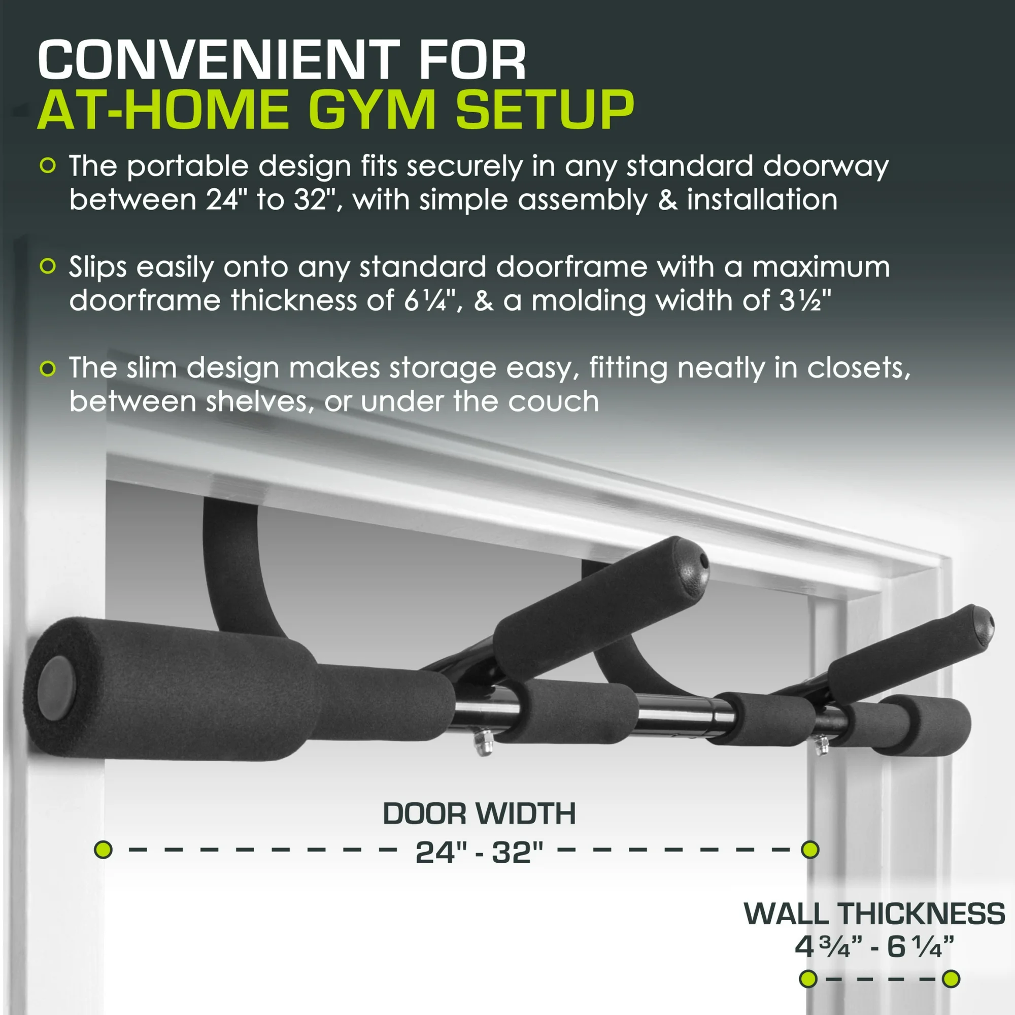- EASY TO USE – Portable design easily fits on any standard doorway 24″ to 32″ and is simple to assemble and install